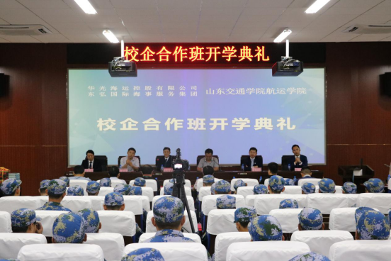 校企合作班开学典礼在威海校区第二报告厅举行,华光船务管理(香港)有限公司执行总经理张晓曦,东弘国际海事服务集团董事长姜明旸、培训总监张伟,山东交院华光海运液运培训中心总经理祝孔学,分党委书记陈海泳、院长王明雨出席开学典礼。开学典礼由分党委书记陈海泳主持。