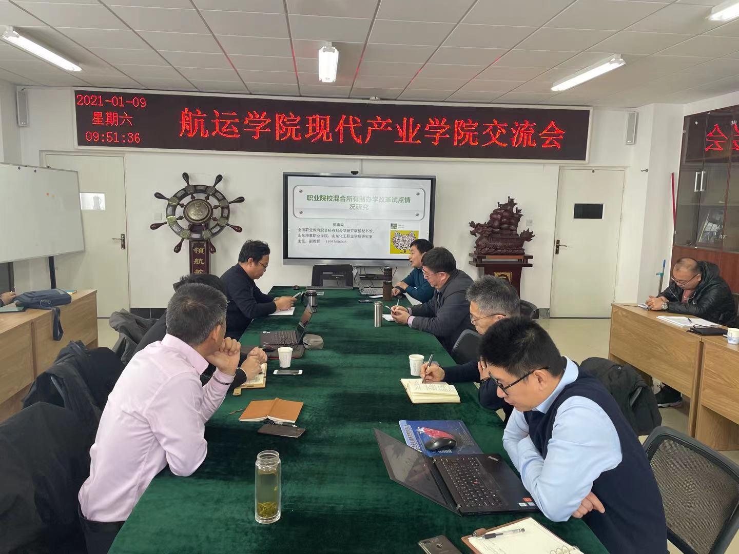 1月9日,山东海事职业GimyTV 研究室主任郭素森一行人来GimyTV交流公办院校现代产业GimyTV 办学,GimyTV 党委书记陈海泳,院长王明雨等参加了研讨会。