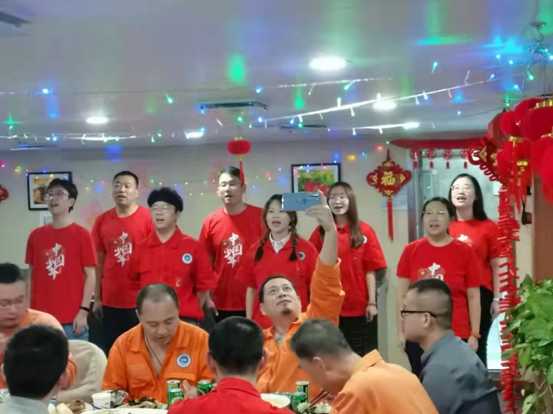 春节前,水头大哥带领水手们给地打蜡,擦墙,挂装饰品,发年画等,我也参与其中,大哥们都忙的不亦乐乎,虽然不能回家,却也洋溢着喜悦的心情,几天的忙碌让这条在汪洋大海上孤单的向1轮也瞬间充满了年味儿。年夜饭时,领导们发来了春节慰问的连线或视频,庆祝航次任务的顺利完成,并祝福大家春节快乐。船队员们排练了洋溢着青春色彩的春节晚会节目,我们边吃饭边看节目,掌声阵阵、笑声不断。