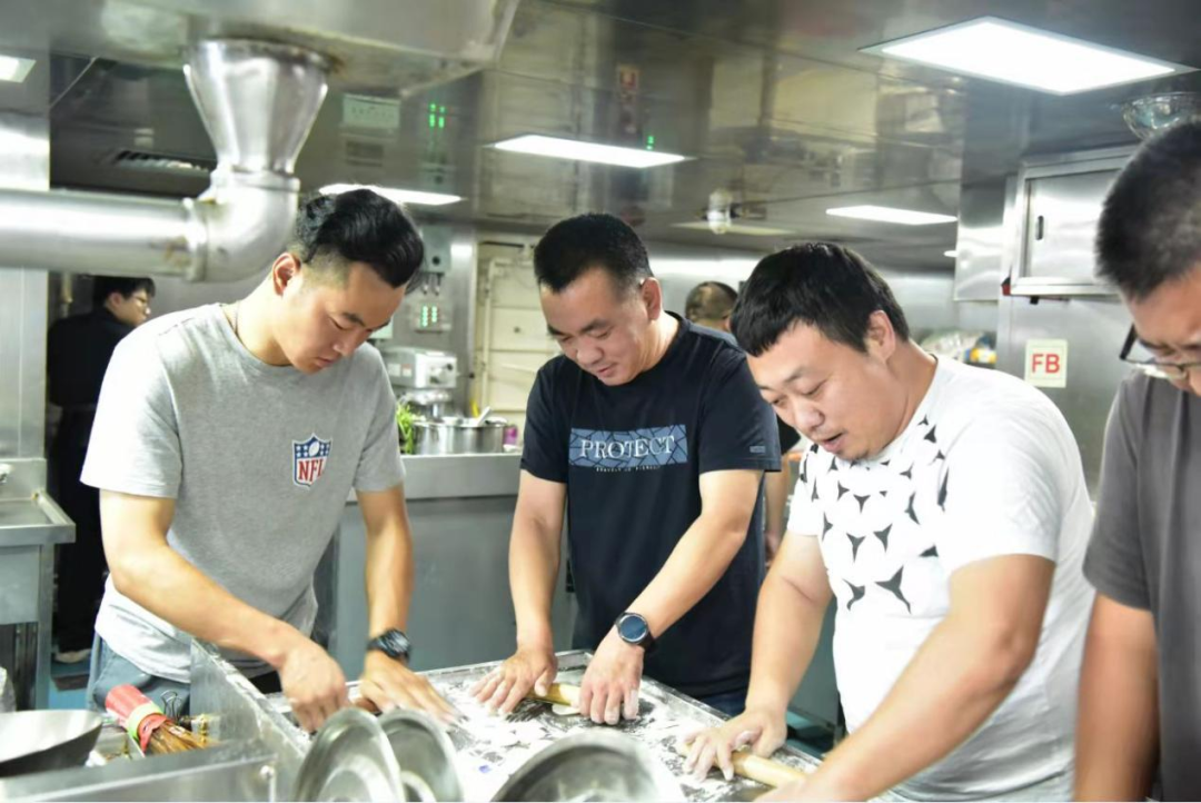 聚餐时,不仅有人献歌,还有抽奖活动,大家吃着热气腾腾的火锅或者厨房师傅们精心准备的菜肴,聊天畅谈。包包子或者饺子时,船队员们奇思妙想、花样百出,包出了各种奇形怪状、酸甜苦辣味儿馅儿的包子或饺子,更有趣的是谁吃到特定口味的饺子还能获得大奖。整个餐厅坐满一桌又一桌的人,看着各式各样又不乏艺术感的包子、饺子,让船上的枯燥生活又多了一丝烟火气。