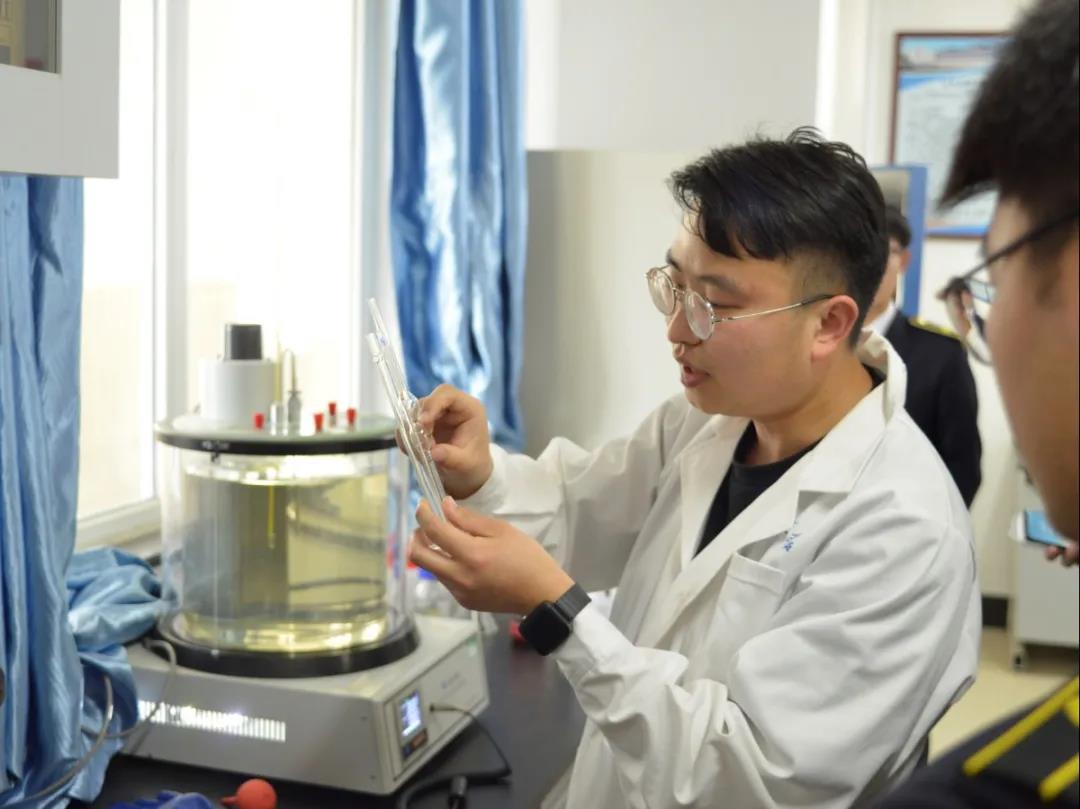 5月23日上午,山东航海文化科普基地老师刘冰冰、张敏带领基本志愿者走进海洋生态修复、油液分析、溢油应急处理等重点实验室,近距离参观海洋防污染、溢油处理等专业设施,开展互动交流学习。