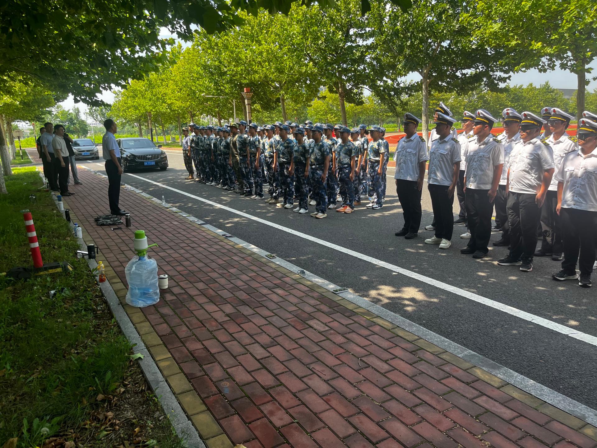 在军训现场,刘庆波与同学们并肩而立,关切询问训练进展,点赞卓越班“半军管”模式下挺拔的军姿与昂扬的斗志。他勉励大家:“将汗水化作航标,把纪律刻成船舵,在军训中锤炼‘航海人’的钢铁意志,为未来护航深蓝奠定精神基石”。