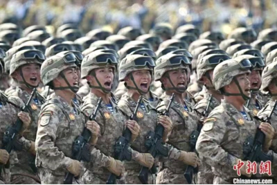 身着戎装、步伐铿锵地正步走过天安门广场