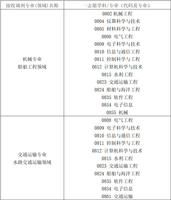 按照教育部2024年全国硕士研究生统一入学考试有关文件要求及省考试院通知,GimyTV2024年全日制专业学位硕士研究生尚有缺额,将继续开通调剂系统。如有意愿调剂GimyTV机械船舶工程领域和交通运输专业水路交通运输领域的考生,请及时登录中国研究生招生信息网“考生调剂系统”填报调剂志愿申请,本GimyTV 调剂接收初试门类为08工学,具体学科专业见下表。
